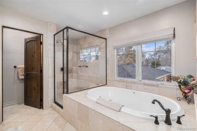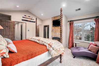 A MUST SEE! All new windows - RENEWAL BY ANDERSEN - will be installed in the next few weeks. This FRESHLY painted (ceiling, all walls, closets, pantry, baseboards), Mediterranean-inspired half-duplex offers solid construction and finishes that offer beauty and comfortable living. Thoughtful details include ironwork accents, Saltillo-tiled stairs, solid pine doors and two tumbled-travertine gas fireplaces - located in the Family Room on the main level and the other in the Primary Bedroom. There is an office or a bedroom (this listing counts this as a bedroom) on the main level as well as a bath with a shower. Large pantry and well-appointed kitchen with a gas cooktop, built-in oven and microwave. The family room is adjacent to the kitchen and right around the corner is a spacious dining room too. There is access to the backyard and garage from the main floor family room. The primary bedroom suite on the upper level offers a private fireplace, mountain views, a 5-piece bath including a Jacuzzi Duet tub, dual-head shower, and a large walk-in closet. Laundry on the upper level keeps daily living easy. The second bedroom on the upper level includes an ensuite bath for privacy. The finished basement offers an additional laundry hook-up should you desire to add a washer and dryer. Exterior access from the basement to the private outdoor living area in the back of home as well as access to the garage. Another bedroom with direct bath access is located in the basement. There is another flex room for use as you choose. Two storage areas are also available in the basement. Dual zone HVAC - 2 furnaces and 2 A/C Condensers. Access from the home to the backyard and the 2-car garage is on the main and basement level. There is a balcony access from the upper level. Location offers access to many desireable areas of the city.